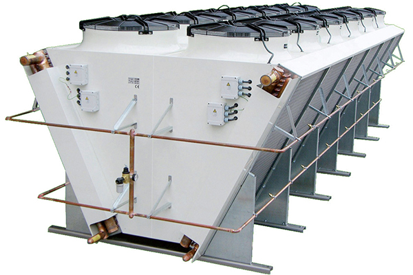 Adiabatic products are air-cooled coolers or condensers with adiabatic pre-coolers. Before the fan draws the ambient air through the finned coil, the air is pre-cooled adiabatically.
